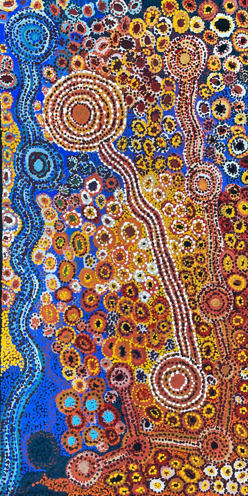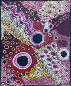 Through fearless colour, rhythmic mark-making and a mesmerising sense of movement, Aileen translates the eternal Tjukurpa into a vivid visual language. Her Wanampi glide beneath the red earth, coil through rockholes and rise with the storm clouds, embodying both the life-giving force of rain and the ancestral law that has sustained Anangu for millennia.