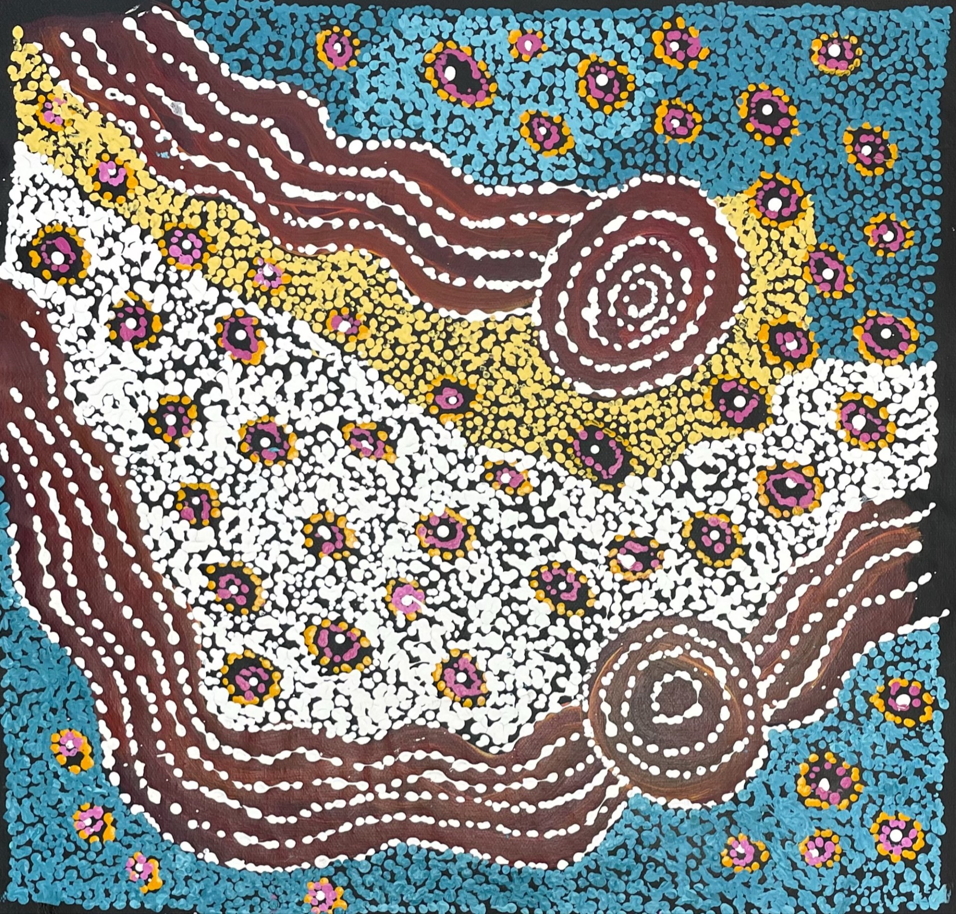 A solo exhibition by Aileen Adamson In her bold new series Piltati Wanampi, 2025, Pitjantjatjara artist Aileen Adamson presents fourteen luminous paintings that sing the ancient Wanampi Tjukurpa (Rainbow Serpent Water Dreaming) of Piltati, a sacred site in the far north-west of the Anangu Pitjantjatjara Yankunytjatjara (APY) Lands. Carrying forward one of the most celebrated songlines of the Western Desert, Aileen continues the artistic legacy of her grandfather, the late Tiger Palpatja (c.1920–2012), one of the APY Lands’ foundational painters and a senior custodian of these same Wanampi stories. Alongside her mother Kukika Adamson, her sister Andrea Adamson, and her aunt Rini Tiger, Aileen belongs to a remarkable multi-generational family of artists who have each brought the shimmering presence of the water serpents into contemporary painting. Through fearless colour, rhythmic mark-making and a mesmerising sense of movement, Aileen translates the eternal Tjukurpa into a vivid visual language. Her Wanampi glide beneath the red earth, coil through rockholes and rise with the storm clouds, embodying both the life-giving force of rain and the ancestral law that has sustained Anangu for millennia. The Tjukurpa of Piltati Two lazy snake brothers lived at Piltati with their industrious sister-wives, who hunted every day for kuka (meat). Tired of feeding their idle husbands, the women one day ate all the food themselves. Enraged, the brothers transformed into enormous Wanampi, the ancestral rainbow serpents. They teased the women with false tracks, leading them on a furious chase across the country. Digging deep as they pursued the serpents, the sisters carved a 25-kilometre watercourse, gorge and rocky valley—the living landscape of Piltati we see today. In the dramatic climax, the elder sister speared the larger Wanampi, only to be swallowed whole in retribution, while the younger serpent devoured his wife. Their immense bodies remain in the land, guarding the precious water and teaching the consequences of greed and disrespect. With Piltati Wanampi, 2025, Aileen Adamson asserts herself as a powerful new voice within one of the desert’s most significant artistic dynasties, offering viewers a rare and radiant portal into the living heart of Anangu Tjukurpa.