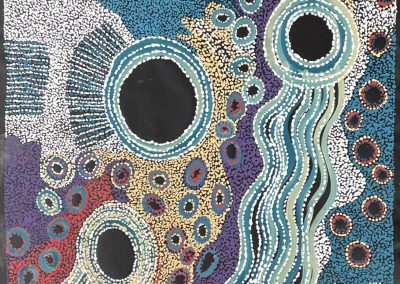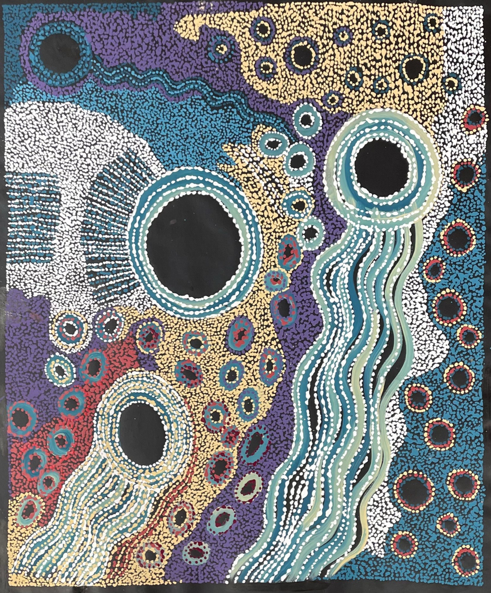 A solo exhibition by Aileen Adamson In her bold new series Piltati Wanampi, 2025, Pitjantjatjara artist Aileen Adamson presents fourteen luminous paintings that sing the ancient Wanampi Tjukurpa (Rainbow Serpent Water Dreaming) of Piltati, a sacred site in the far north-west of the Anangu Pitjantjatjara Yankunytjatjara (APY) Lands. Carrying forward one of the most celebrated songlines of the Western Desert, Aileen continues the artistic legacy of her grandfather, the late Tiger Palpatja (c.1920–2012), one of the APY Lands’ foundational painters and a senior custodian of these same Wanampi stories. Alongside her mother Kukika Adamson, her sister Andrea Adamson, and her aunt Rini Tiger, Aileen belongs to a remarkable multi-generational family of artists who have each brought the shimmering presence of the water serpents into contemporary painting. Through fearless colour, rhythmic mark-making and a mesmerising sense of movement, Aileen translates the eternal Tjukurpa into a vivid visual language. Her Wanampi glide beneath the red earth, coil through rockholes and rise with the storm clouds, embodying both the life-giving force of rain and the ancestral law that has sustained Anangu for millennia. The Tjukurpa of Piltati Two lazy snake brothers lived at Piltati with their industrious sister-wives, who hunted every day for kuka (meat). Tired of feeding their idle husbands, the women one day ate all the food themselves. Enraged, the brothers transformed into enormous Wanampi, the ancestral rainbow serpents. They teased the women with false tracks, leading them on a furious chase across the country. Digging deep as they pursued the serpents, the sisters carved a 25-kilometre watercourse, gorge and rocky valley—the living landscape of Piltati we see today. In the dramatic climax, the elder sister speared the larger Wanampi, only to be swallowed whole in retribution, while the younger serpent devoured his wife. Their immense bodies remain in the land, guarding the precious water and teaching the consequences of greed and disrespect. With Piltati Wanampi, 2025, Aileen Adamson asserts herself as a powerful new voice within one of the desert’s most significant artistic dynasties, offering viewers a rare and radiant portal into the living heart of Anangu Tjukurpa.