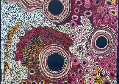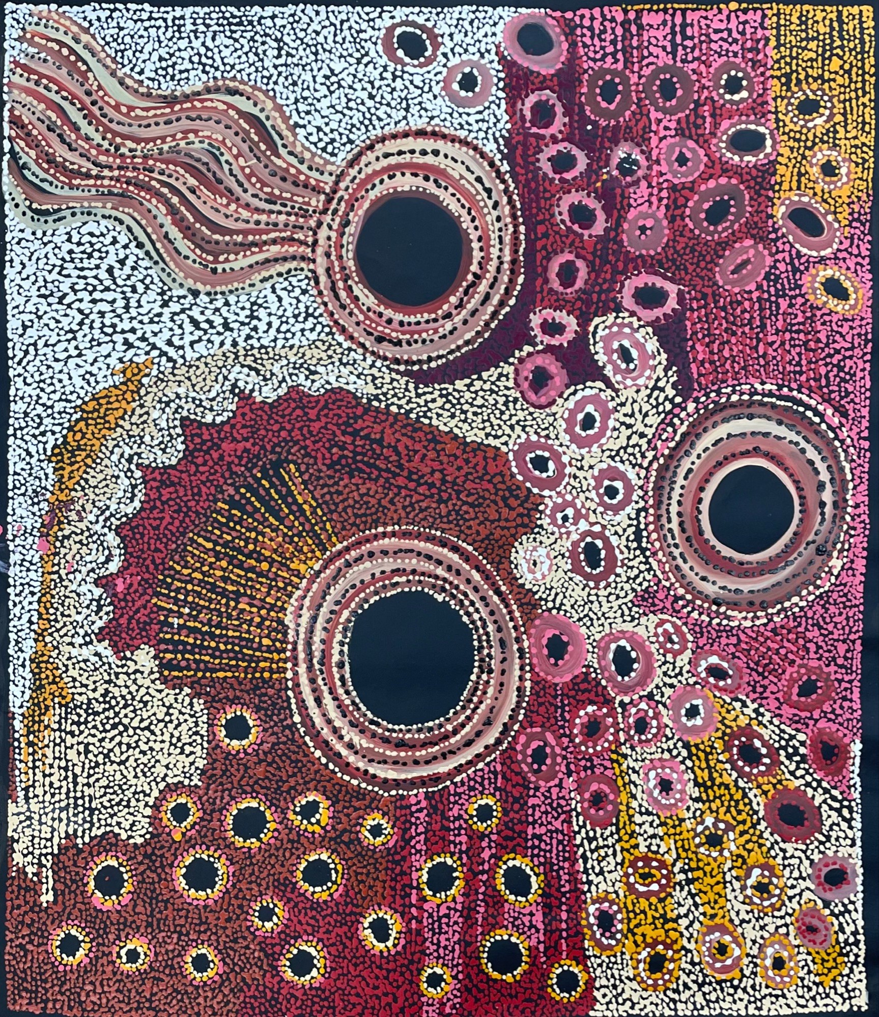 A solo exhibition by Aileen Adamson In her bold new series Piltati Wanampi, 2025, Pitjantjatjara artist Aileen Adamson presents fourteen luminous paintings that sing the ancient Wanampi Tjukurpa (Rainbow Serpent Water Dreaming) of Piltati, a sacred site in the far north-west of the Anangu Pitjantjatjara Yankunytjatjara (APY) Lands. Carrying forward one of the most celebrated songlines of the Western Desert, Aileen continues the artistic legacy of her grandfather, the late Tiger Palpatja (c.1920–2012), one of the APY Lands’ foundational painters and a senior custodian of these same Wanampi stories. Alongside her mother Kukika Adamson, her sister Andrea Adamson, and her aunt Rini Tiger, Aileen belongs to a remarkable multi-generational family of artists who have each brought the shimmering presence of the water serpents into contemporary painting. Through fearless colour, rhythmic mark-making and a mesmerising sense of movement, Aileen translates the eternal Tjukurpa into a vivid visual language. Her Wanampi glide beneath the red earth, coil through rockholes and rise with the storm clouds, embodying both the life-giving force of rain and the ancestral law that has sustained Anangu for millennia. The Tjukurpa of Piltati Two lazy snake brothers lived at Piltati with their industrious sister-wives, who hunted every day for kuka (meat). Tired of feeding their idle husbands, the women one day ate all the food themselves. Enraged, the brothers transformed into enormous Wanampi, the ancestral rainbow serpents. They teased the women with false tracks, leading them on a furious chase across the country. Digging deep as they pursued the serpents, the sisters carved a 25-kilometre watercourse, gorge and rocky valley—the living landscape of Piltati we see today. In the dramatic climax, the elder sister speared the larger Wanampi, only to be swallowed whole in retribution, while the younger serpent devoured his wife. Their immense bodies remain in the land, guarding the precious water and teaching the consequences of greed and disrespect. With Piltati Wanampi, 2025, Aileen Adamson asserts herself as a powerful new voice within one of the desert’s most significant artistic dynasties, offering viewers a rare and radiant portal into the living heart of Anangu Tjukurpa.