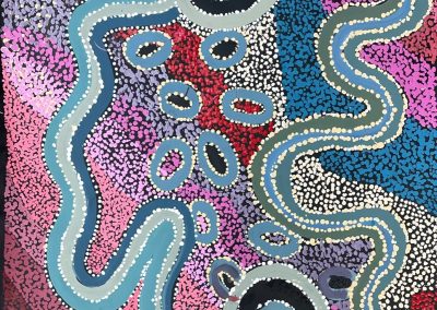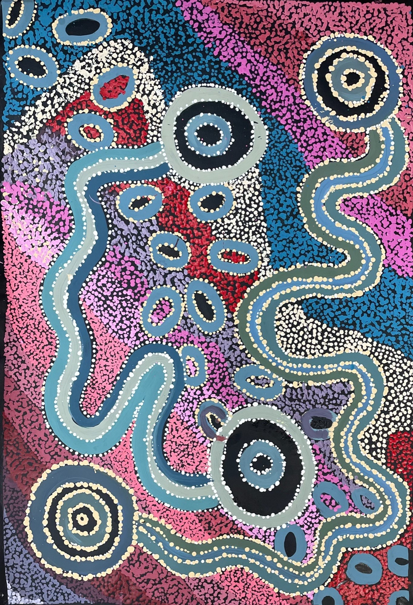 A solo exhibition by Aileen Adamson In her bold new series Piltati Wanampi, 2025, Pitjantjatjara artist Aileen Adamson presents fourteen luminous paintings that sing the ancient Wanampi Tjukurpa (Rainbow Serpent Water Dreaming) of Piltati, a sacred site in the far north-west of the Anangu Pitjantjatjara Yankunytjatjara (APY) Lands. Carrying forward one of the most celebrated songlines of the Western Desert, Aileen continues the artistic legacy of her grandfather, the late Tiger Palpatja (c.1920–2012), one of the APY Lands’ foundational painters and a senior custodian of these same Wanampi stories. Alongside her mother Kukika Adamson, her sister Andrea Adamson, and her aunt Rini Tiger, Aileen belongs to a remarkable multi-generational family of artists who have each brought the shimmering presence of the water serpents into contemporary painting. Through fearless colour, rhythmic mark-making and a mesmerising sense of movement, Aileen translates the eternal Tjukurpa into a vivid visual language. Her Wanampi glide beneath the red earth, coil through rockholes and rise with the storm clouds, embodying both the life-giving force of rain and the ancestral law that has sustained Anangu for millennia. The Tjukurpa of Piltati Two lazy snake brothers lived at Piltati with their industrious sister-wives, who hunted every day for kuka (meat). Tired of feeding their idle husbands, the women one day ate all the food themselves. Enraged, the brothers transformed into enormous Wanampi, the ancestral rainbow serpents. They teased the women with false tracks, leading them on a furious chase across the country. Digging deep as they pursued the serpents, the sisters carved a 25-kilometre watercourse, gorge and rocky valley—the living landscape of Piltati we see today. In the dramatic climax, the elder sister speared the larger Wanampi, only to be swallowed whole in retribution, while the younger serpent devoured his wife. Their immense bodies remain in the land, guarding the precious water and teaching the consequences of greed and disrespect. With Piltati Wanampi, 2025, Aileen Adamson asserts herself as a powerful new voice within one of the desert’s most significant artistic dynasties, offering viewers a rare and radiant portal into the living heart of Anangu Tjukurpa.