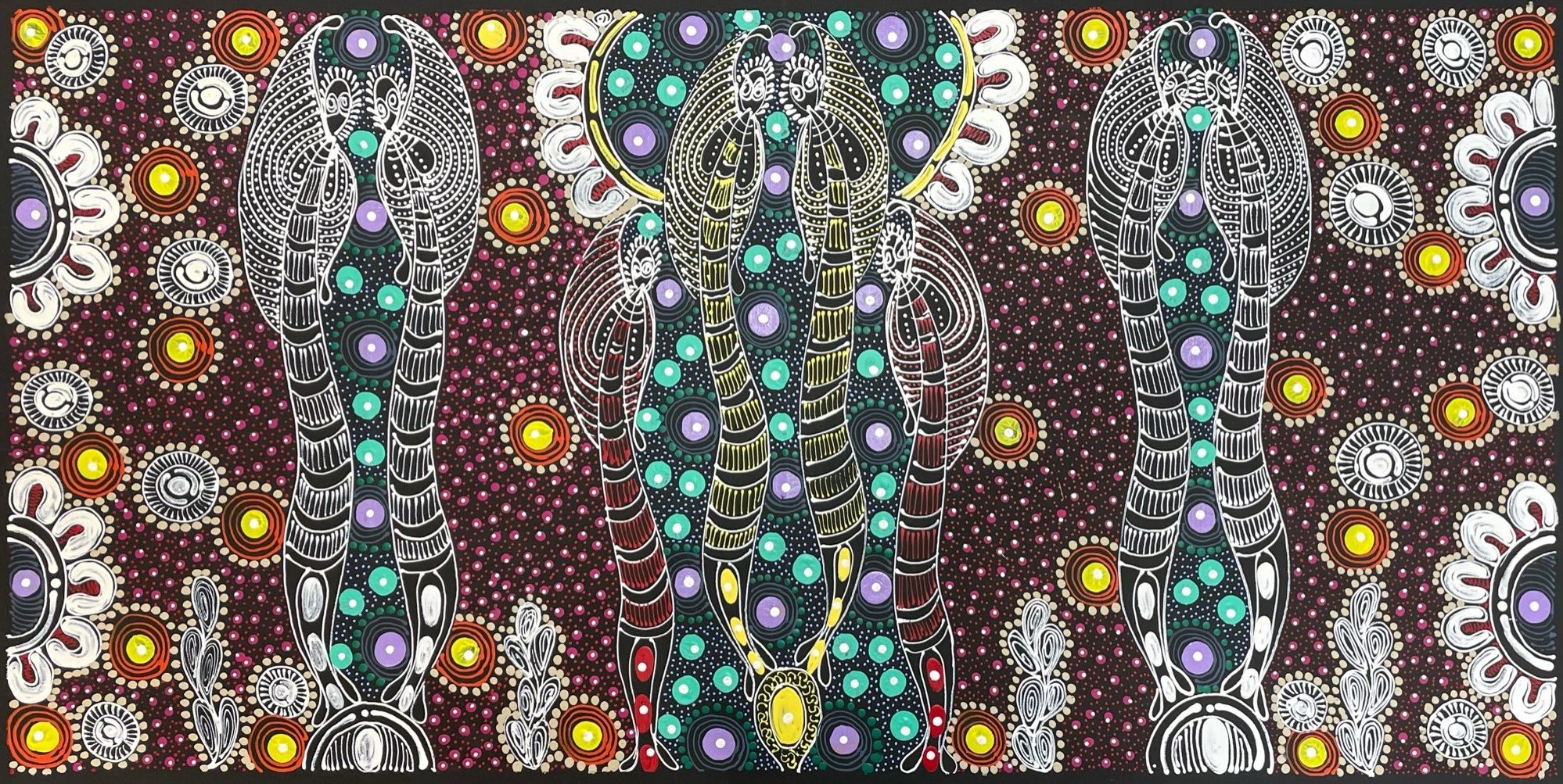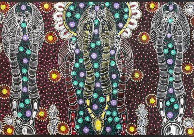 Colleen is known for her precise dot work and use of vibrant colours. Her most popular works are her ‘Dreamtime Sisters’ series which the Eastern Arrente people call “Irrernte-arenye”. It is the role of these ancestral spirit figures to look after their Country, to guide their people and guard important areas of land (In particular, sacred and ceremonial sites). These works are beautiful, with intricate dotting and bold colours that represent wildflowers and berries blossoming in the desert after a big rain.