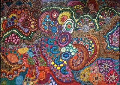 Yilpi Marks grew up at Ernabella, where both her parents were artists. Later she moved to Papunya and has merged the stylistic influences and use of colour from the artistic traditions from both communities. The paintings of this talented partnership are a rich tapestry of colour and imagery.