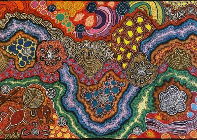 Together, their canvases unfold as vivid maps of the landscape—swirling hills, rugged outcrops, and meandering waterways—layered with ceremonial elements, bush foods like seeds and fruits, and resilient desert vegetation. These works burst with life, weaving cultural narratives that highlight the desert’s spiritual significance to its custodians.