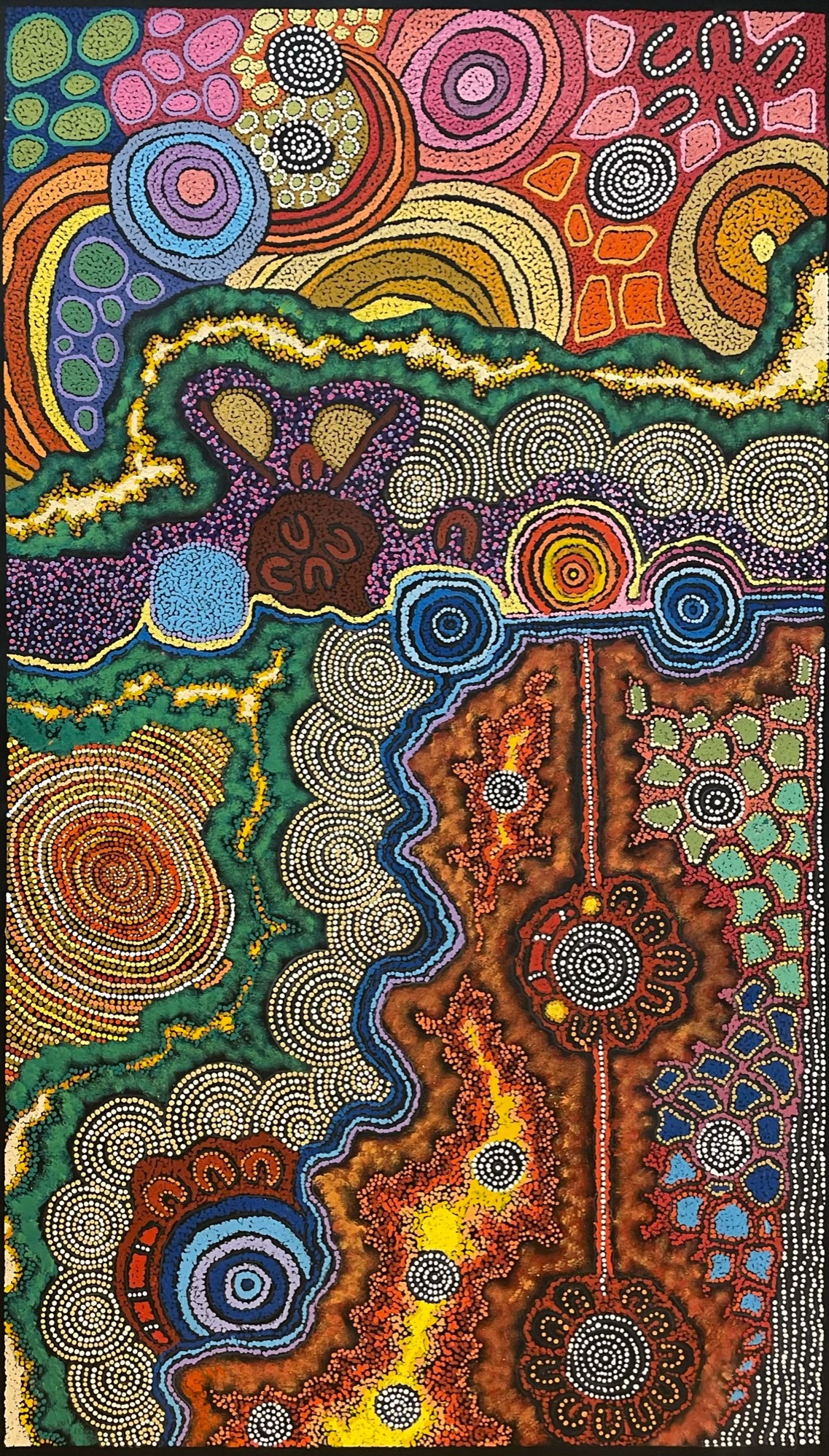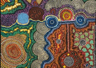 Together, their canvases unfold as vivid maps of the landscape—swirling hills, rugged outcrops, and meandering waterways—layered with ceremonial elements, bush foods like seeds and fruits, and resilient desert vegetation. These works burst with life, weaving cultural narratives that highlight the desert’s spiritual significance to its custodians.