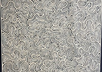 George’s signature work ‘Tingari’ depicts his dreaming, which focuses on the creation of his country their sacred sites.