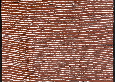 This striking tali (sandhills) painting by Mantua James Nangala (also known as Mantua Nangala) captures the vast, rippling sand dunes of her Pintupi Country in the Gibson Desert,