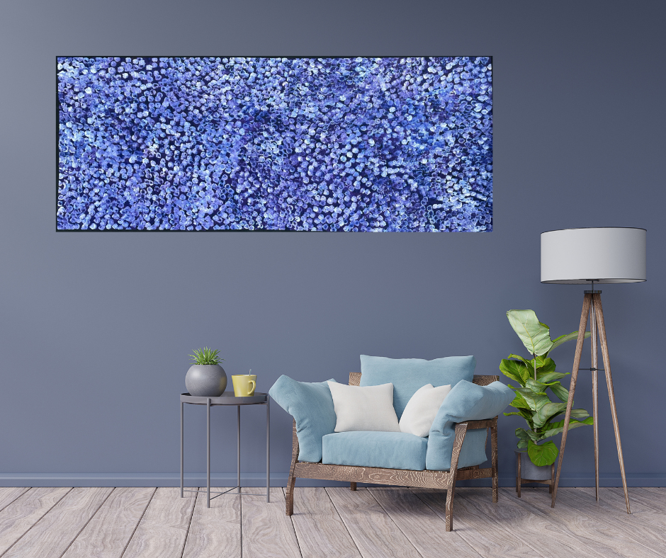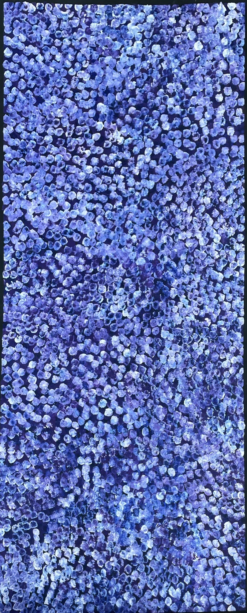 During the Dreamtime, winds came from all directions, carrying the Arnwetky seed all over Polly’s ancestors’ Anmatyerre land. To ensure the continued fruiting of the Arnwetky, the Anmatyerre people pay homage to the spirit of the bush plum by recreating it in their ceremonies through song and dance, and in recent years, through painting. The patterns in the paintings can represent the fruit of the plant, its leaves and flowers, and also the body paint designs that are associated with it during ceremony.