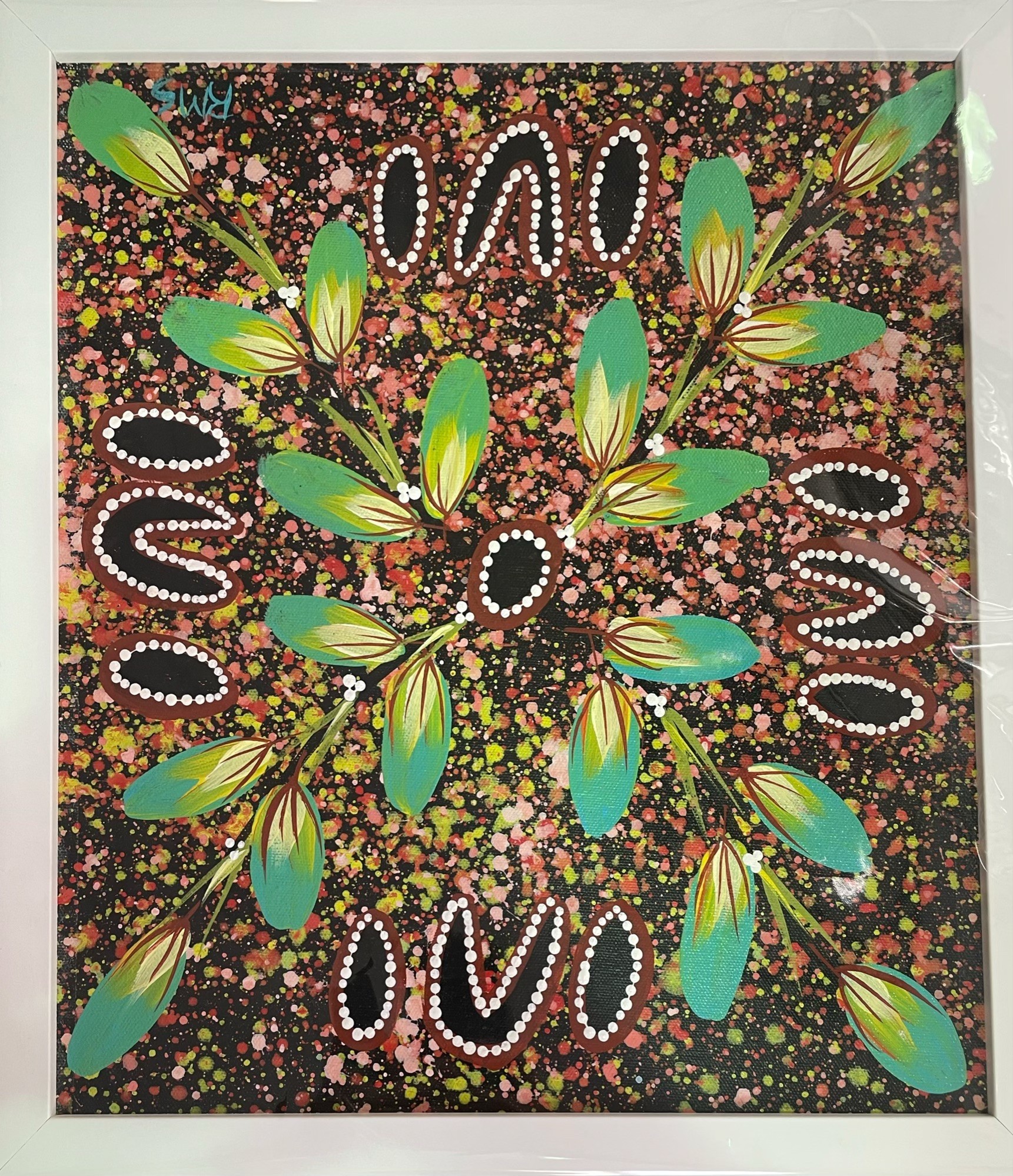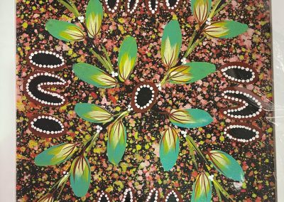 After spending his young adulthood working as a station hand and fencer on cattle stations, Reggie transitioned to a full-time professional artist in 1985. Seeking to distinguish himself from the prevalent dot painting style of the time, he developed a signature technique characterized by leaf stencils and speckled, splotchy backgrounds, often using acrylics on canvas with a matte finish. His paintings incorporate traditional Aboriginal symbols to convey stories of hunting, gathering bush tucker, and cultural practices rooted in his mother’s country around Barrow Creek and Neutral Junction. Notable themes include his celebrated Bush Tucker Gathering series and Seven Sisters Dreaming, which draws on the Milky Way and desert sky narratives.