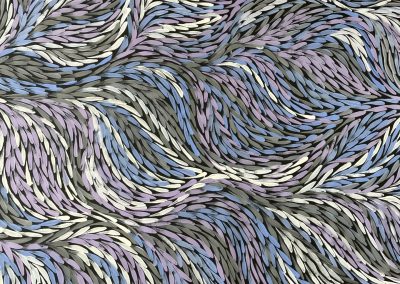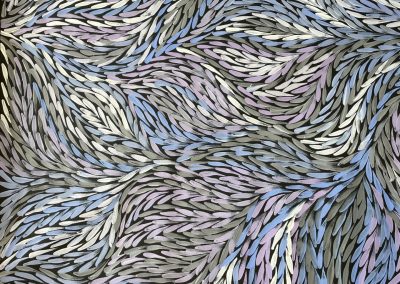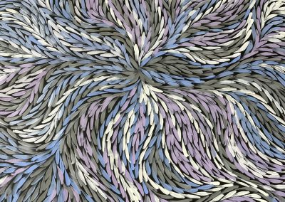 In her paintings, she incorporates traditional iconography and realistic elements. The themes are primarily bush medicines, yam dreaming and body painting. As a bush woman, she is familiar with her land and its abundance of bush tucker species, medicine plants and native fauna. These are the stories inherited by her, along with important women’s stories, and which form the basis of her paintings.